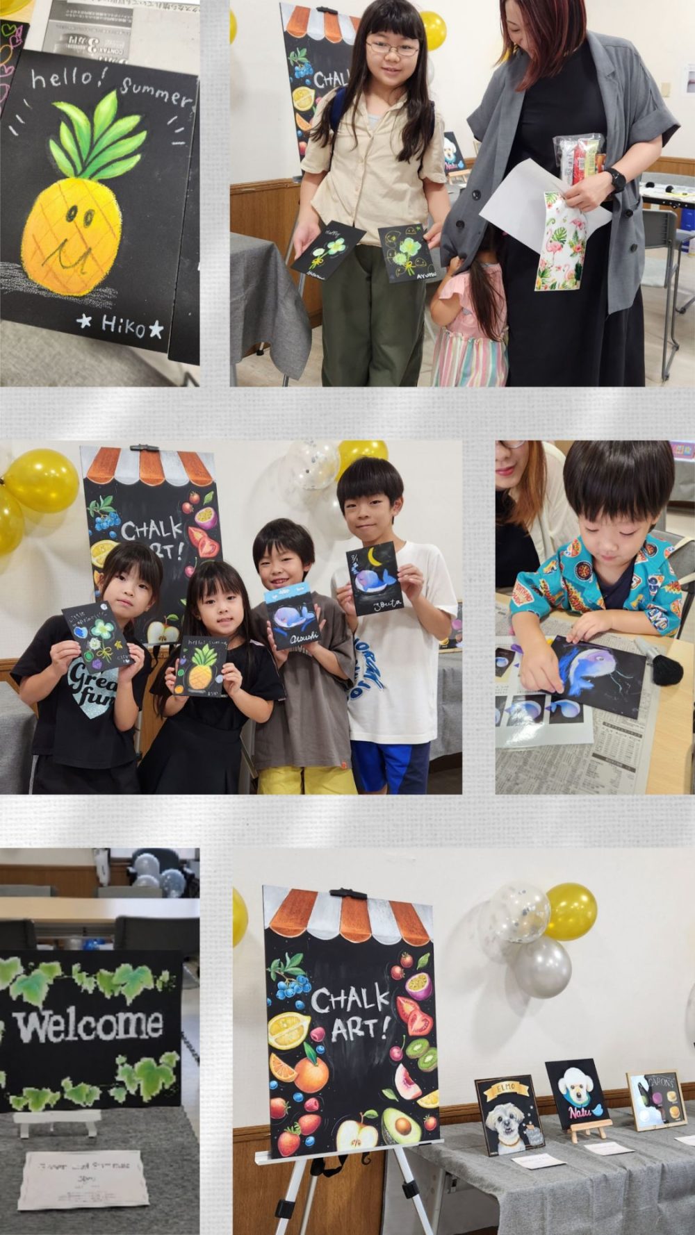 会場は川崎市宮前区西野川・宮山スポーツプラザの貸しホール。9名の生徒さん(大人も子どもも)のチョークアートが一室にずらっと並び、いつもは別コースで会う機会のない生徒さん同士も初顔合わせ&お互いの作品鑑賞。わいわい賑やかで、ずっと笑顔が絶えない2日間になりました。